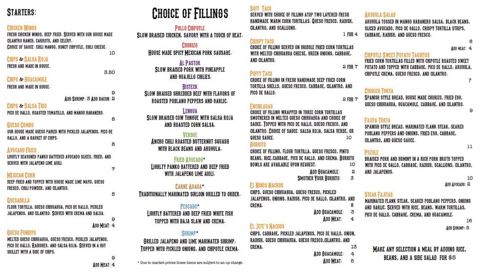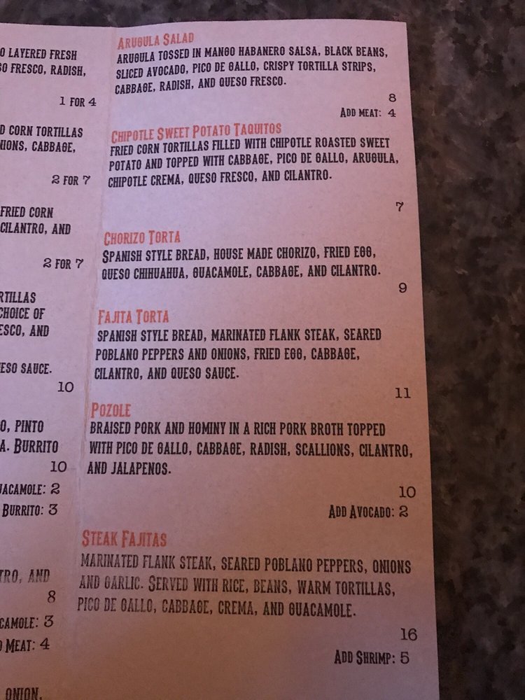 arugula tossed in mango habanero salsa, black beans, sliced avocado, pico de gallo, crispy tortilla strips, cabbage, radish, and queso fresco. You can add meat for an additional charge.